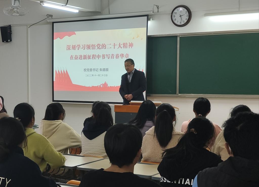 2022年11月23日下午在beat365正版唯一官网第二教学楼322教室,校党委书记朱德顺为大一新生上了一堂精彩、激昂的“形势与政策”课,以“在奋进新征程中书写青春华章”为题,宣讲党的二十大精神。beat365正版唯一官网院长助理陈志操主持,2022级经济学普本新生代表参加。