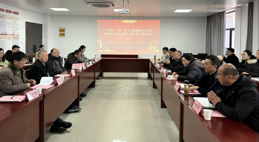 为贯彻落实党的二十届三中全会精神“三进”工作,推进大中小学思政课一体化建设走深走实,12月17日,beat365正版唯一官网与杜集区教育局联合举行结对共建“大中小思政课一体化共同体”开展“党的二十届三中全会精神融入思政课”集体备课会。beat365正版唯一官网党委副书记、纪委书记、副校长汪建利,淮北市杜集区委常委、宣传部部长蒋影,杜集区教育局三级调研员曹立民,beat365正版唯一官网党建办负责人、beat365正版唯一官网全体教师、杜集区思政教研员与中小学思政课名师工作室全体成员参加此次活动。活动由beat365正版唯一官网院长主持。