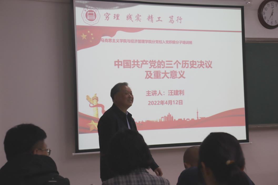 为了切实提升beat365正版唯一官网与经济管理学院首届入党积极分子培训班学员的培训质量,按照学校和学院的培训计划,2022年4月12日晚,在二教422教室,beat365正版唯一官网副校长汪建利同志来到beat365正版唯一官网与经济管理学院分党校入党积极分子培训班,受邀对学员进行题为《中国共产党的三个历史决议及重大意义》的党课培训。本次活动由beat365正版唯一官网与经济管理学分党校负责人、党总支书记吴玲院长主持,总支各个党支部书记及全体入党积极分子培训班全体学员参加。